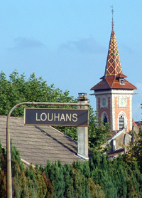 | “Church, Louhans”. © Catherine Winn. View of Church with decorative glazed spire tiles taken from Louhans rail station. |