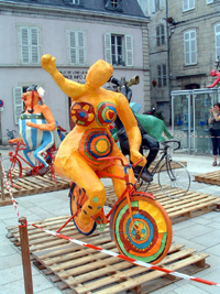 | “5 Tour de France” 7-04 © Catherine Winn. Orange papier mâche figurine in Lons le Saunier square, place of the arrival of one Tour de France stage. |