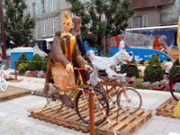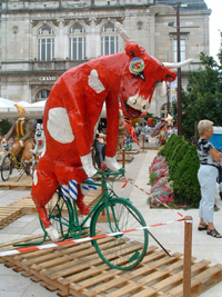 | “11 Tour de France” 7-04 © Catherine Winn. ‘Laughing Cow’ (Vache qui Rit) papier mâche figurine, Tintin in background. Photographed in Lons le Saunier square on arrival of Tour de France stage. |