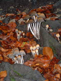 | “Herreson 10” 10-04 © Colin Winn. Toadstools & Autumn leaves under flash photography. Herreson Cascades, Burgundy. |