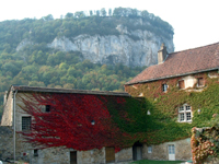 | “Baume les Messieurs 8” 10-04 © Catherine Winn. Closer view of Abbey buildings. Valley trees behind. |