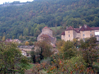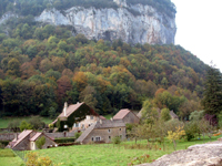 | “Baume les Messieurs 5” 10-04 © Catherine Winn. Village houses backed by tree line and cliff in Autumn colours. |