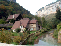 | “Baume les Messieurs 6” 10-04 © Catherine Winn. River flowing through central Baume les Messieurs village, viewing past adjacent cottages with cliff face in background. |