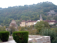 | “Baume les Messieurs 7” 10-04 © Catherine Winn. Ancient Abbey buildings, Baume les Messieurs. Slight haze. Viewed from one side of village opposite to Abbey. |