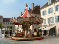 | “Carousel 1 Lons” © Colin Winn. Meticulously painted Carousel ride set in Lons le Saunier square, pictured in afternoon sun. Fountains in background. |