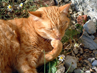 | “Maisie 2” 10-04 © Annabel Winn. Ginger cat lying in afternoon sun on camomile plant and pebbles, licking paw. |