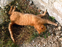 | “Maisie 3” 10-04 © Annabel Winn. Ginger cat outstretched by stone wall, sleeping in afternoon sun. |
