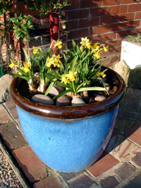 | “Perry Cottage Flowers” 04-04 ©…………. Bright yellow Tête-à-Têtes in blue glazed pot standing on decorative paving in full sun. |