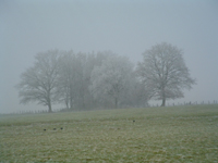 | “Freezing Fog 5” 12-04 © Catherine Winn. Group of trees in freezing fog conditions viewed from across field at Beauvernois, Burgundy. |