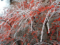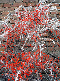 | “Freezing Fog Berries 1” © Catherine Winn. Red berries in freezing fog (pyrocantha). Red brick wall background. |